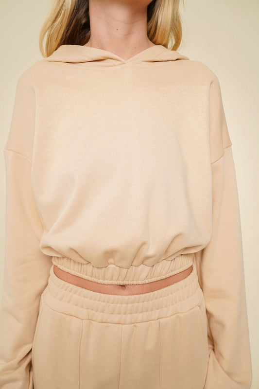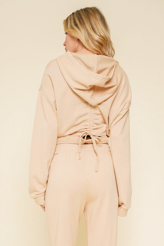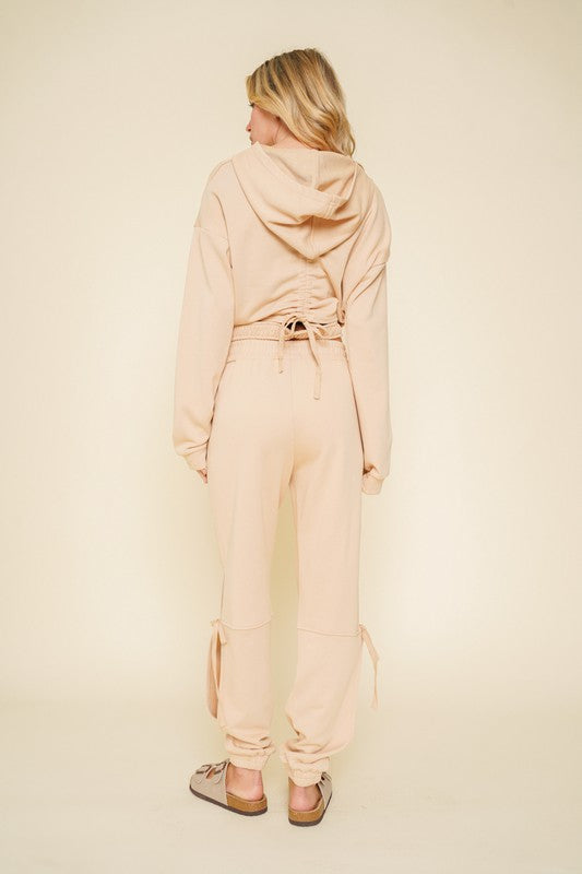 STYLE DETAILS: Ruched cut out back french terrry hoodie with side cut out detail french terry jogger pants. Hoodie and pants sold together as a set.
