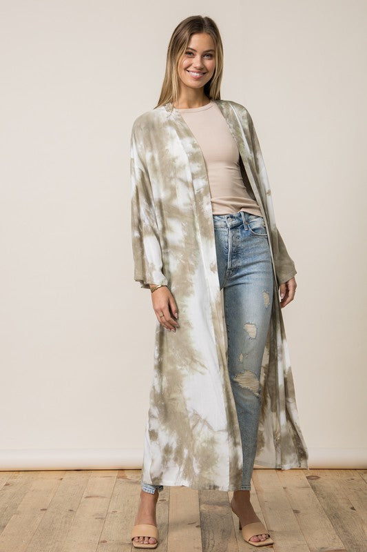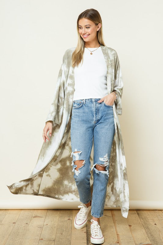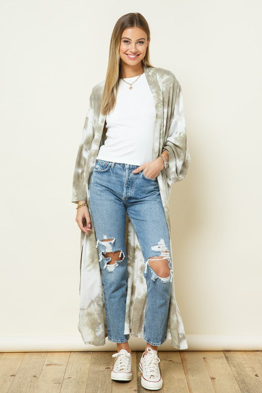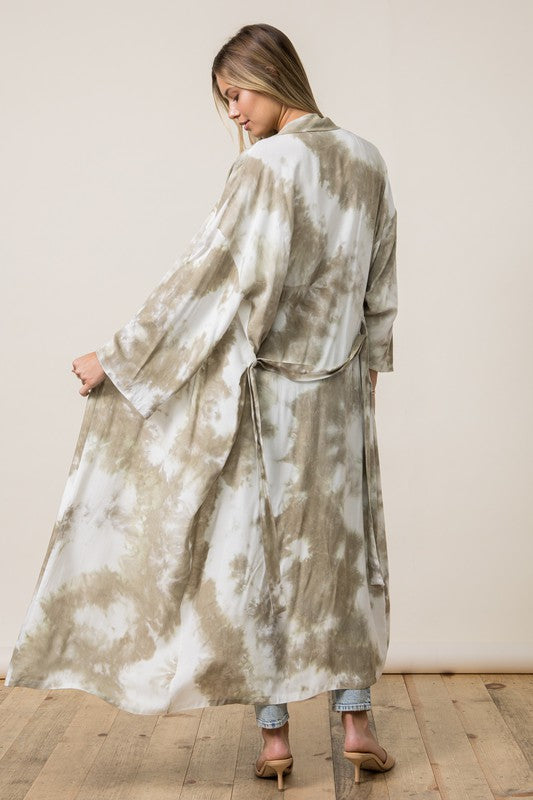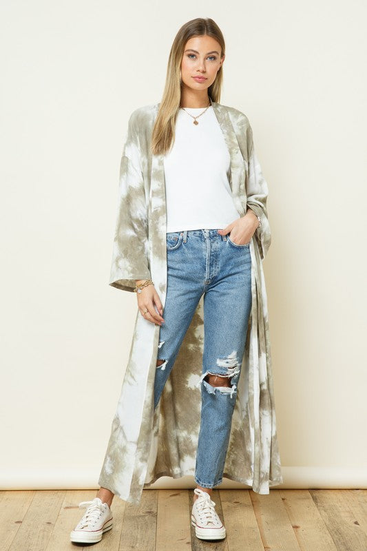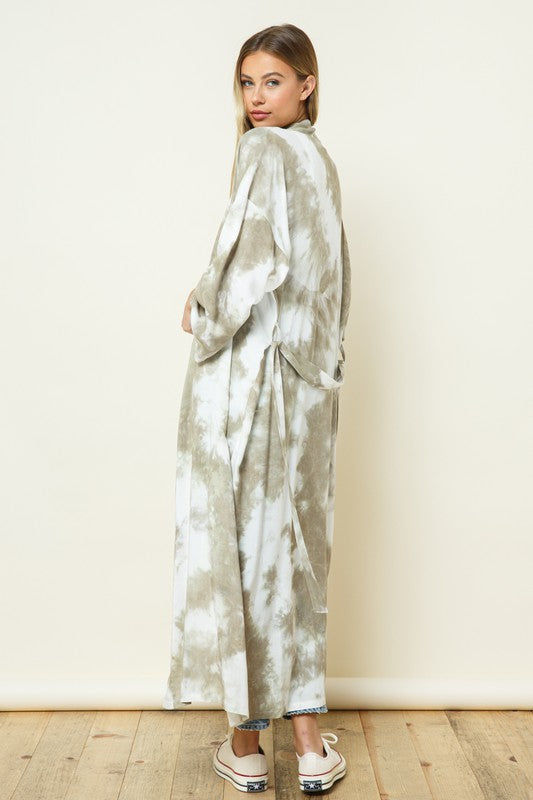 STYLE DETAILS: Full length self tie wrap tie dyed long sleeve duster. Perfect with tee shirt and jeans or as a swim cover up.