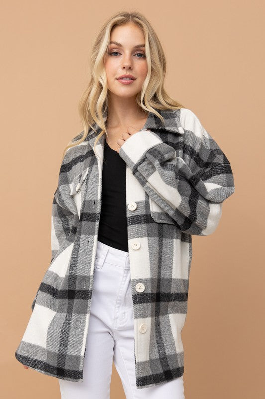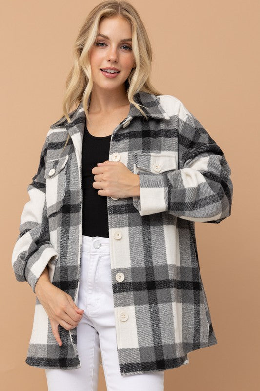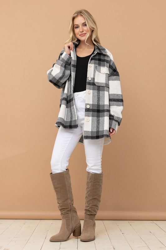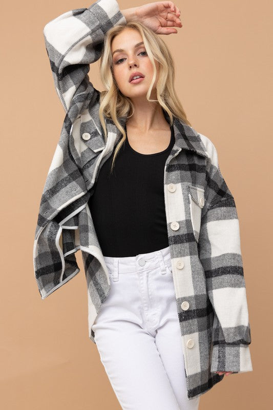 STYLE DETAILS: Black & white plaid shirt/jacket with front pockets. A must have for Fall.