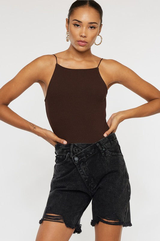 STYLE DETAILS: High rise, cross over denim bermuda shorts in a black stone wash. Length hits above knee for full coverage.