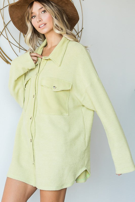 STYLE DETAILS: Oversized shirt jacket with big chest pockets, spread collar and button front closure, chest exaggerated pockets, row edge details, curved hem.
