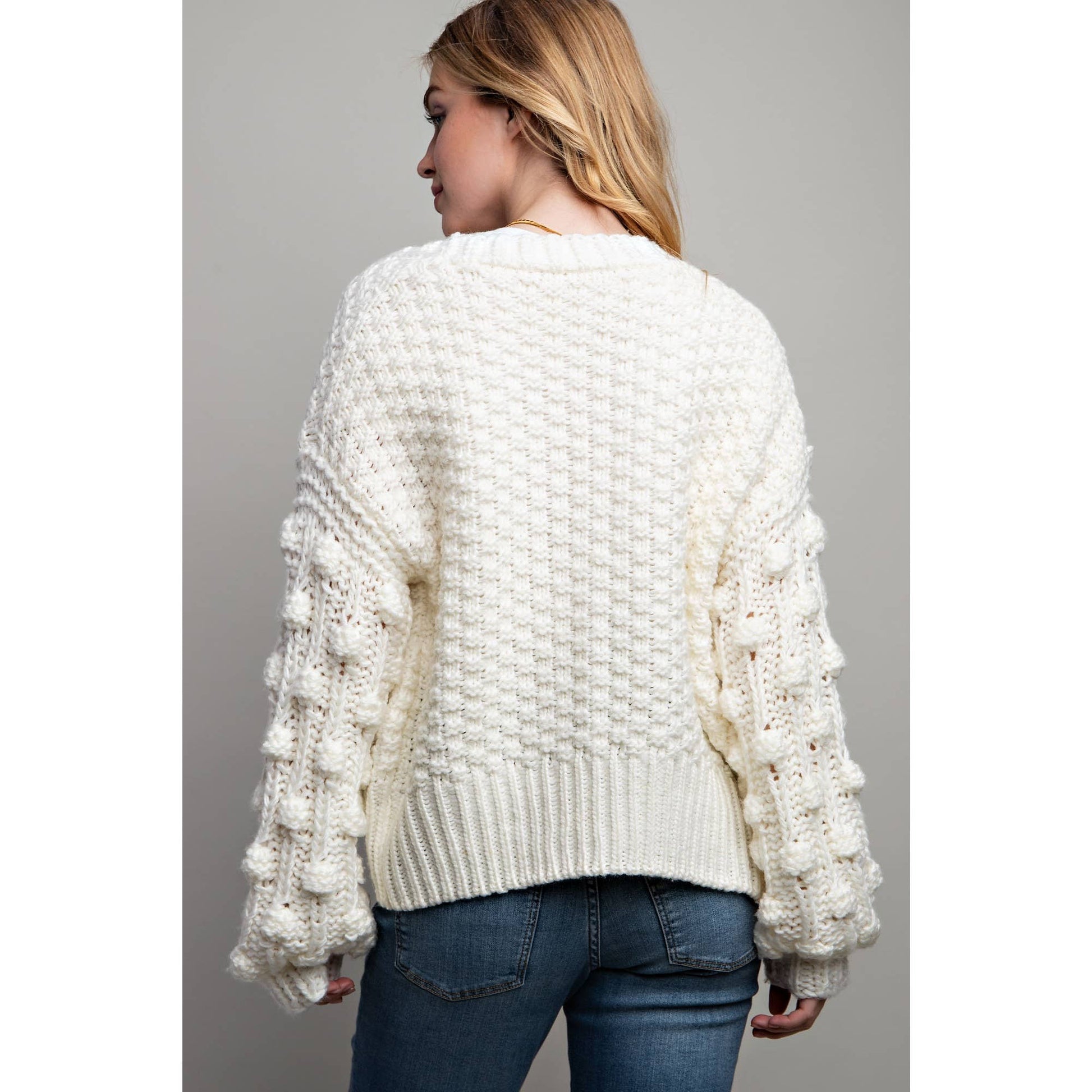 Low neckline design with button down details - Loose fit with slim long sleeve knitwear sweater - Rib band finish on neckline and bottom hems. - Model is 5' 10" 32-25-35 and wearing a Small